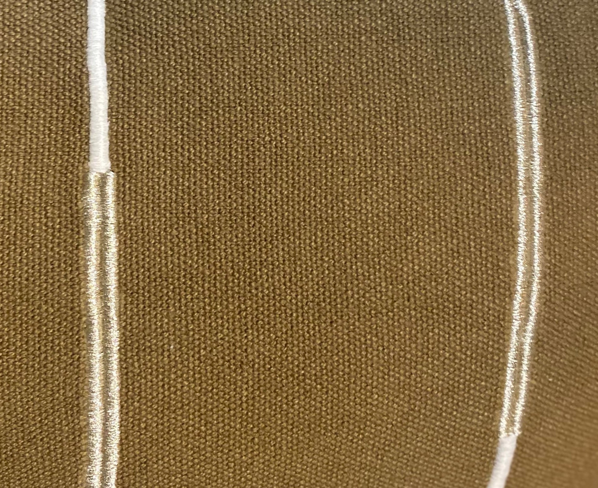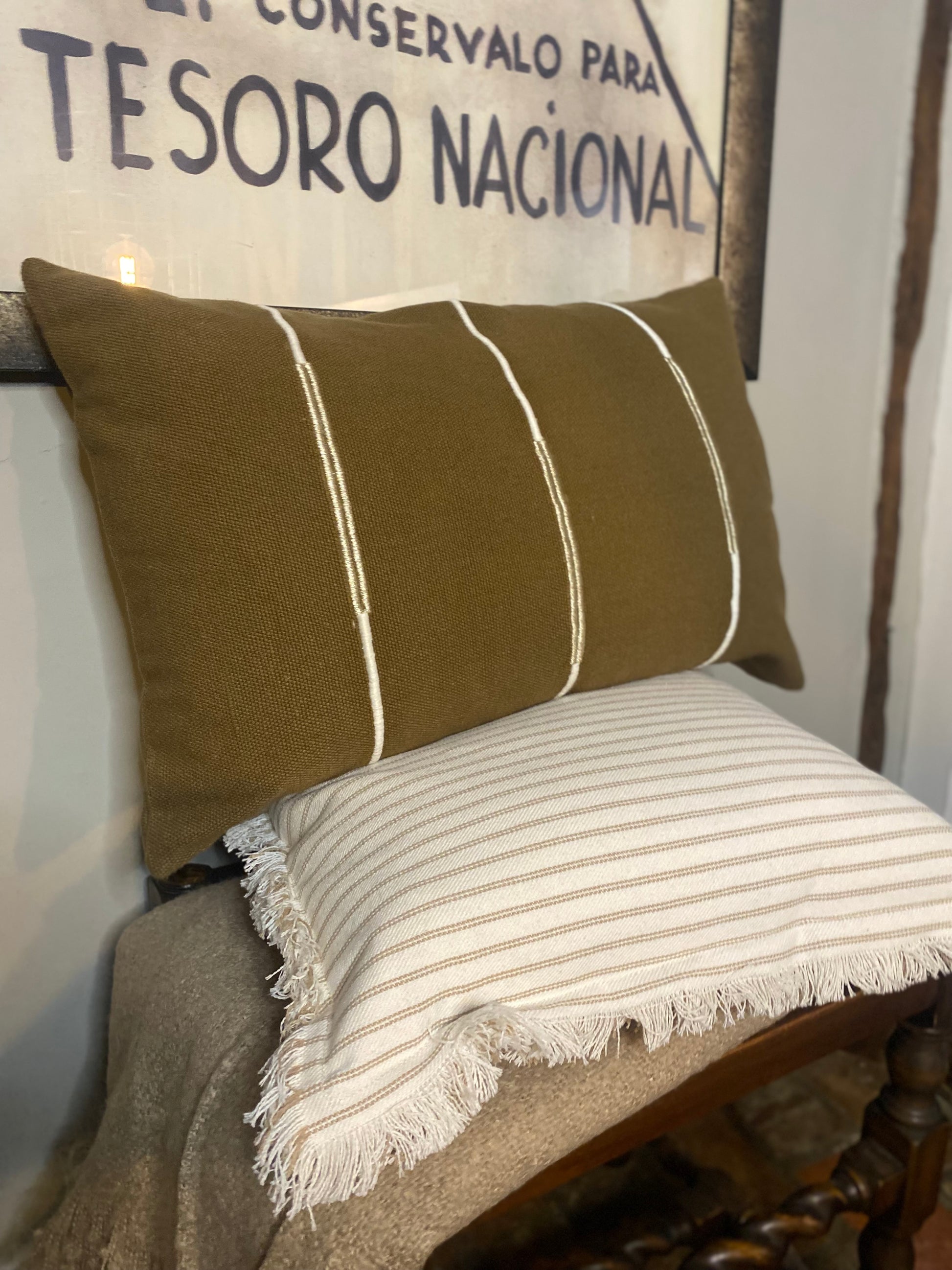 Thick weave cotton cushion cover. Embroidered stripe in white and gold thread. Textural and hard wearing. Mix and match with linens and other stripes